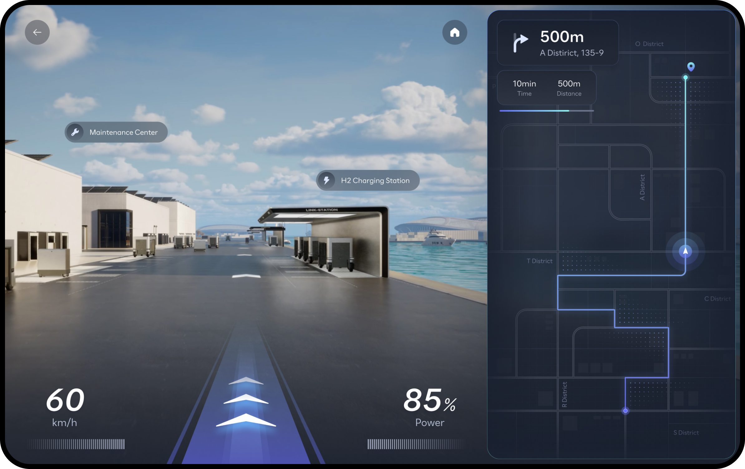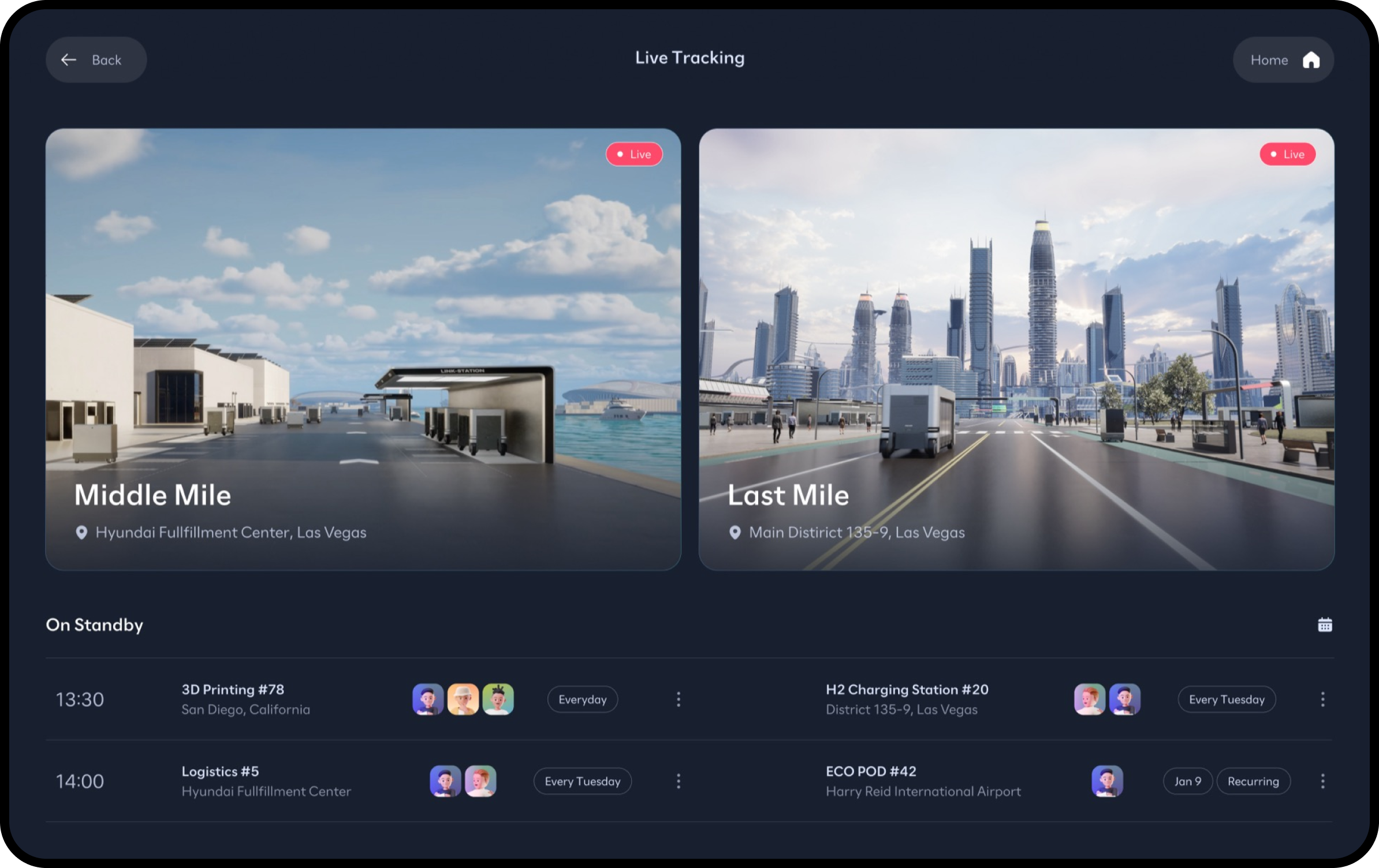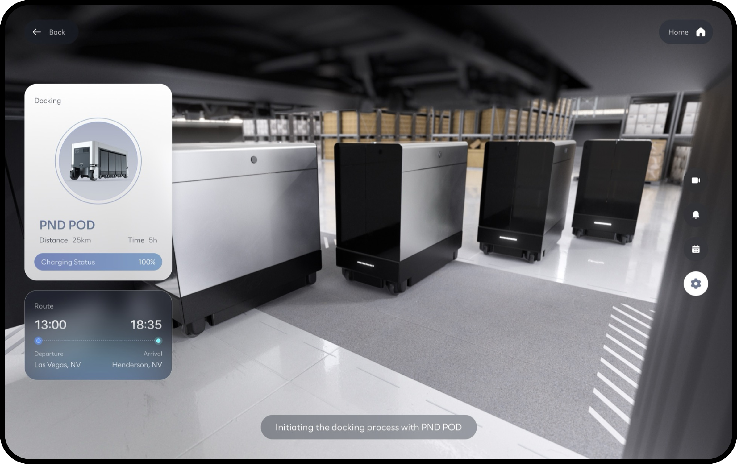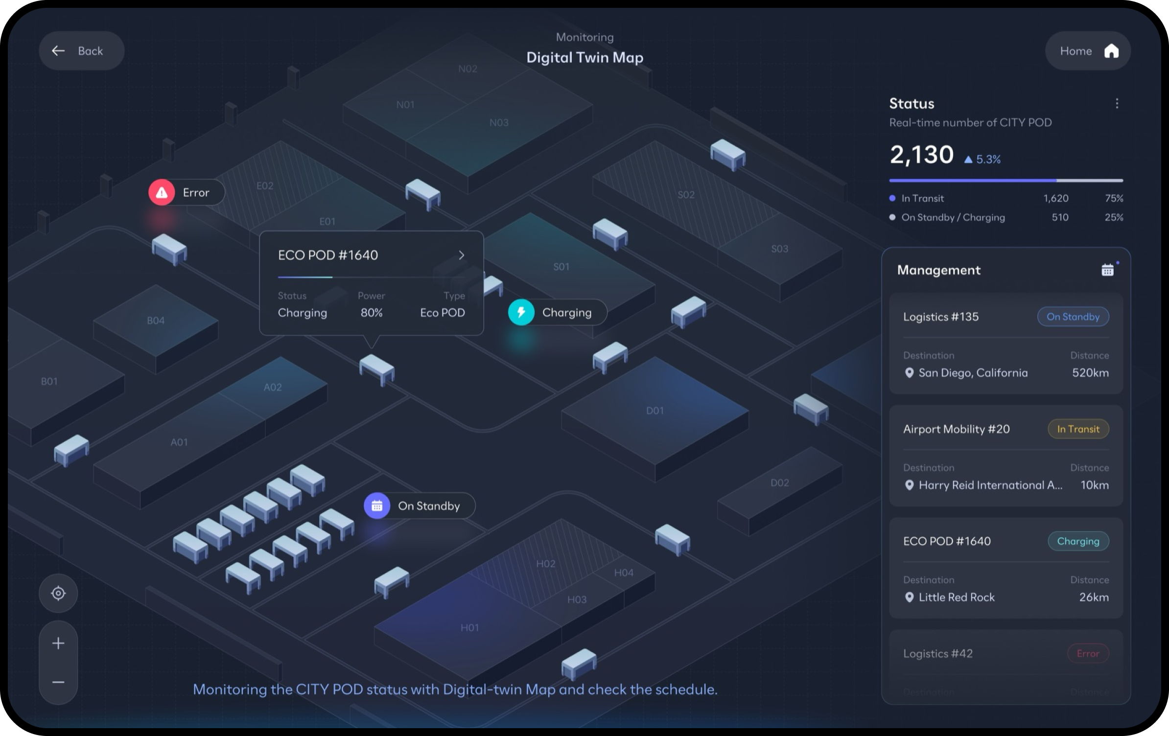 경험의 중심에는 ‘풀필먼트 센터’를 정밀하게 디지털 트윈으로 구현한 시각화가 자리합니다. 관람객은 단순히 화면을 보는 것을 넘어, 실제 물류 운영 과정을 실시간으로 탐험하는 듯한 체험을 하게 됩니다. 차량의 이동 경로와 위치, 모듈의 도킹 상태, 그리고 운영 전반의 현황이 직관적으로 시각화되어 제공되며, 이를 통해 원격 물류 관리자가 현장을 모니터링하고 제어하는 환경을 그대로 간접 체험할 수 있습니다. 이러한 몰입형 경험은 단순한 기술 전시를 넘어, 미래 물류 시스템의 혁신적인 가능성과 그 운영 방식을 직관적으로 전달하는 데 큰 역할을 했습니다.