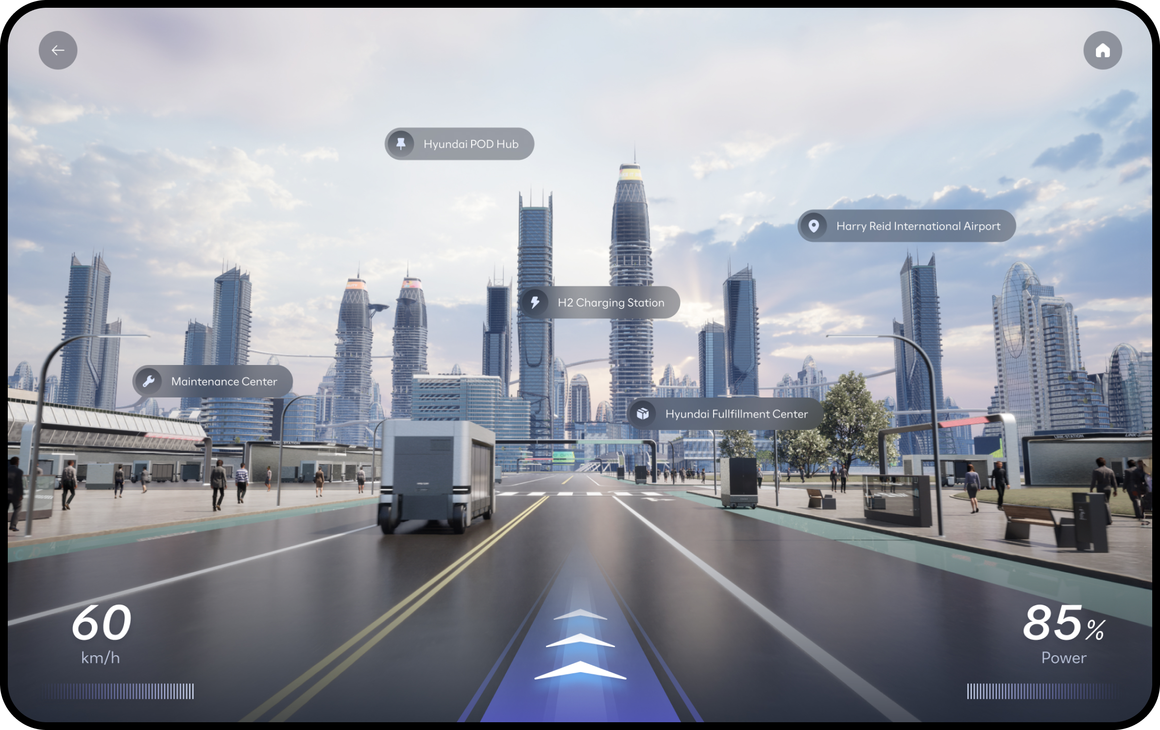 현대자동차는 CES 2024에서 미래 스마트시티의 자율주행 물류 시스템 City POD을 공개했습니다. City POD은 다양한 모듈형 모빌리티 솔루션으로 풀필먼트센터에서의 화물 적재와 도심 배송 거점까지 이어지는 물류의 전 과정을 무인으로 운행합니다. 현대자동차가 제시하는 미래 물류시스템의 비전을 효과적으로 전달하고, 관람객의 전시 이해와 몰입감을 극대화하고자 인터랙티브 컨텐츠를 제작했습니다.