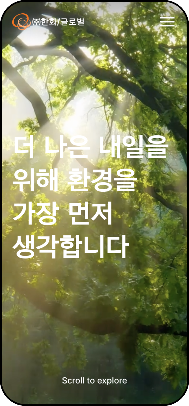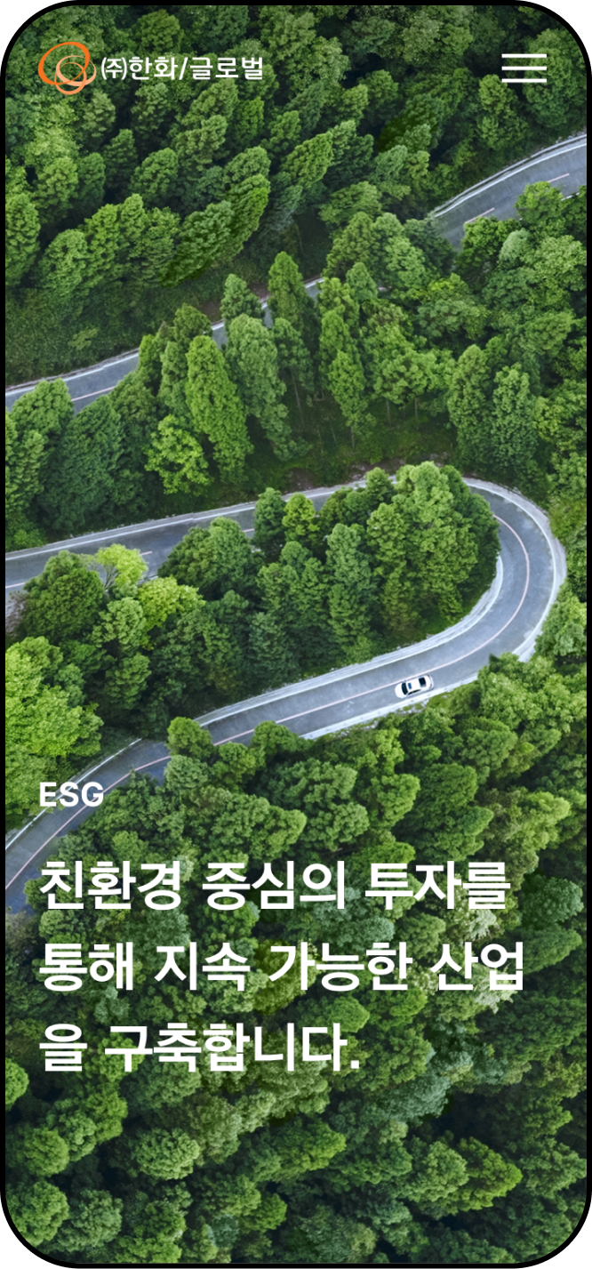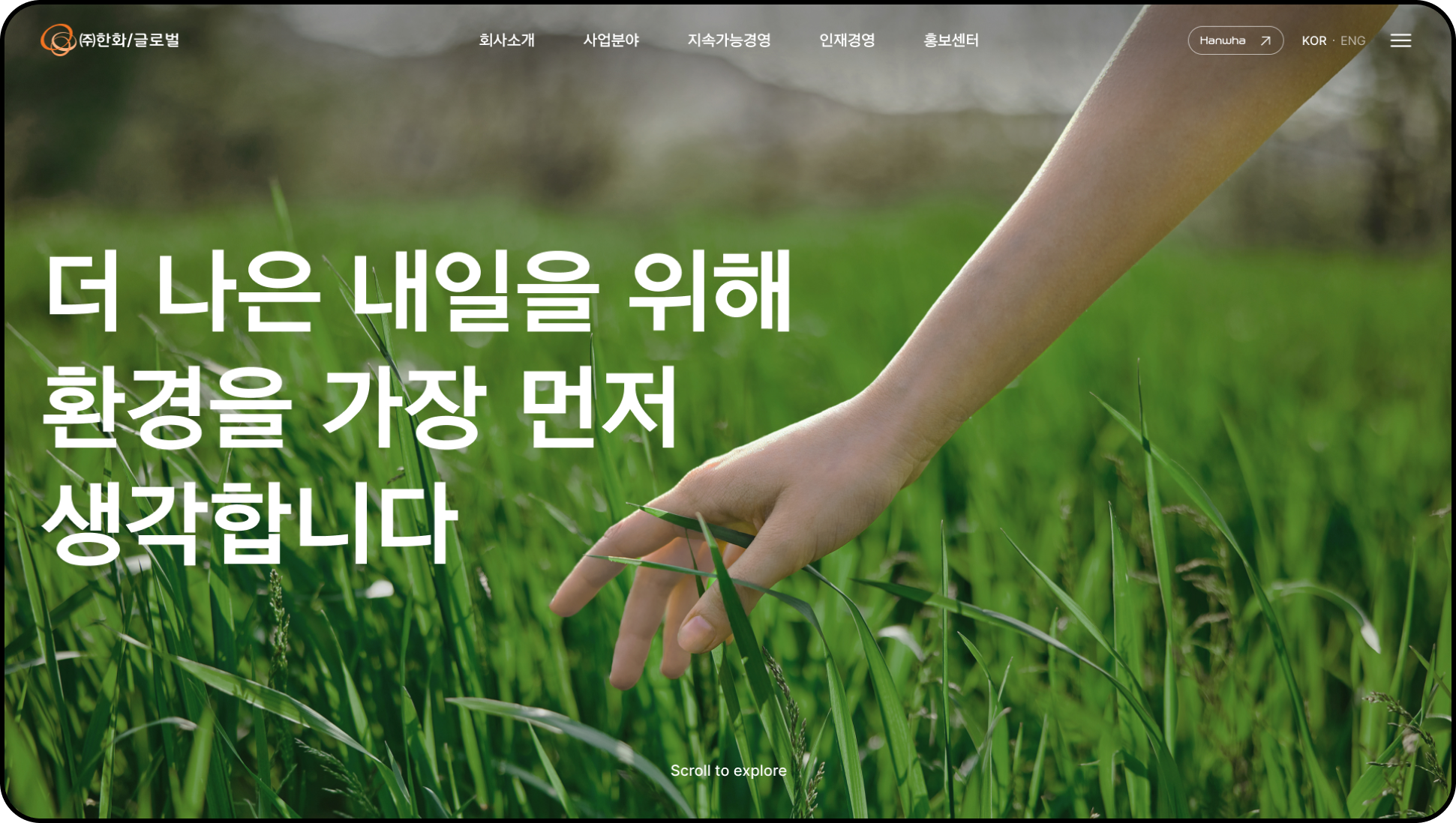 메인 화면은 ESG를 강조하는 이미지와 슬로건으로 시작해 사업 영역, 지속가능경영, 직무 인터뷰 등 다양한 콘텐츠를 최신 트렌드에 맞게 구성했습니다. 이를 통해 한화글로벌이 지향하는 비전을 명확히 전달함과 동시에 취업준비생들에게 보다 친근하고 직관적인 접근성을 제공하도록 개선했습니다.