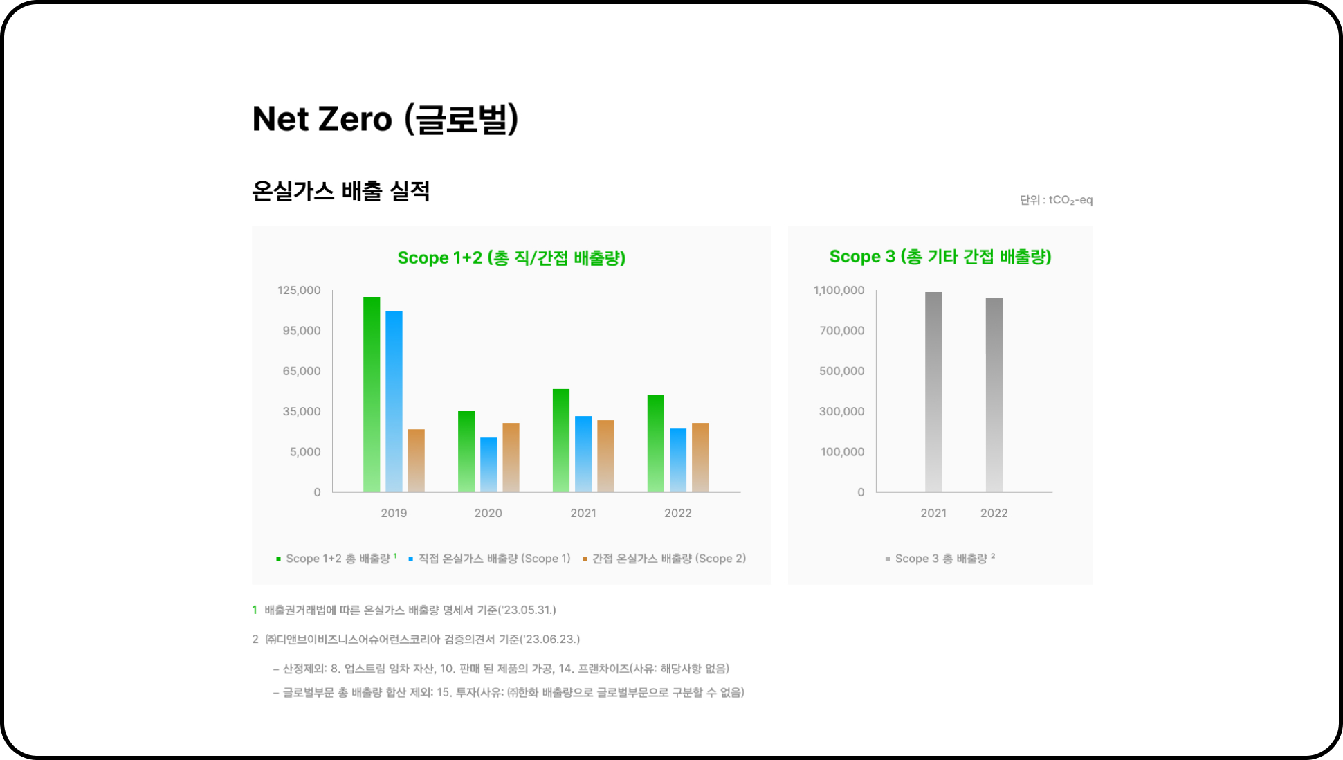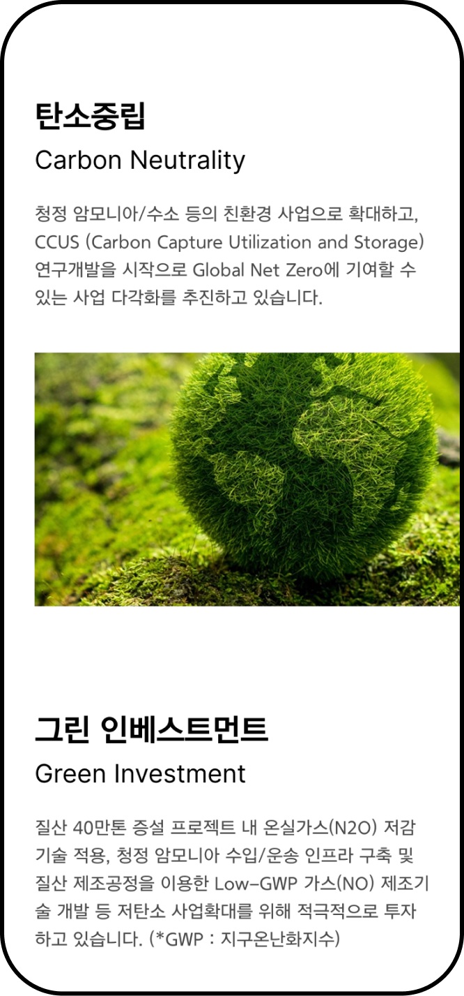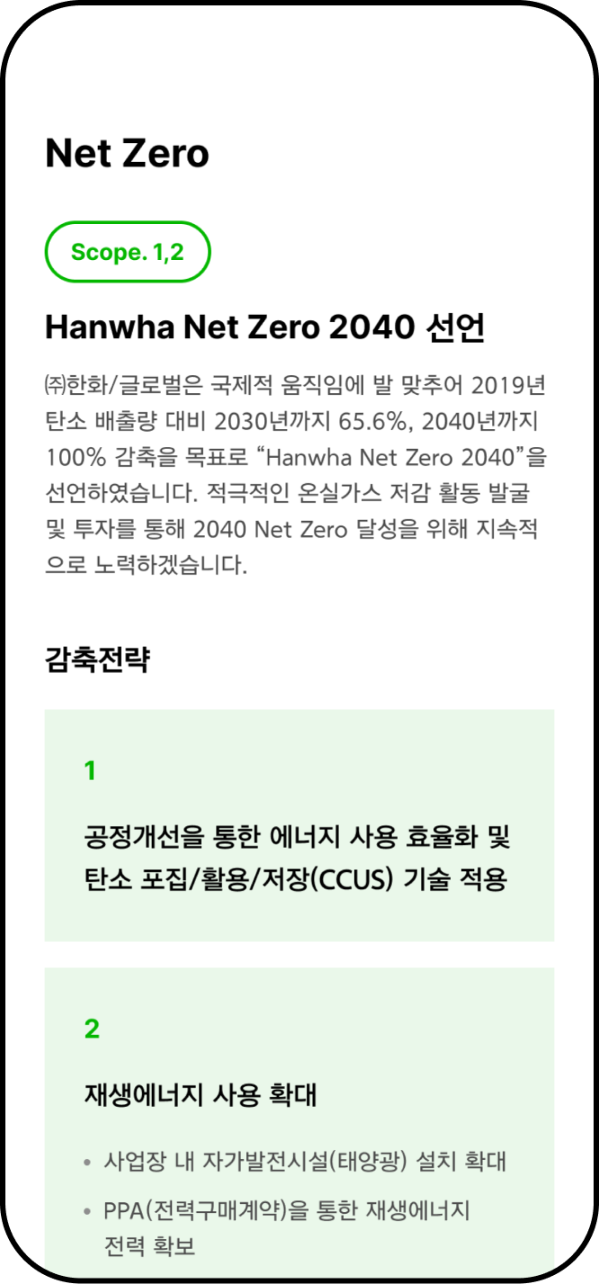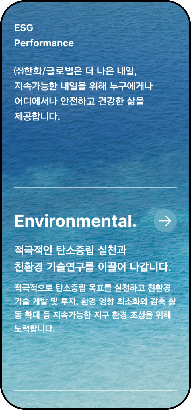 메인 화면은 ESG를 강조하는 이미지와 슬로건으로 시작해 사업 영역, 지속가능경영, 직무 인터뷰 등 다양한 콘텐츠를 최신 트렌드에 맞게 구성했습니다. 이를 통해 한화글로벌이 지향하는 비전을 명확히 전달함과 동시에 취업준비생들에게 보다 친근하고 직관적인 접근성을 제공하도록 개선했습니다.
