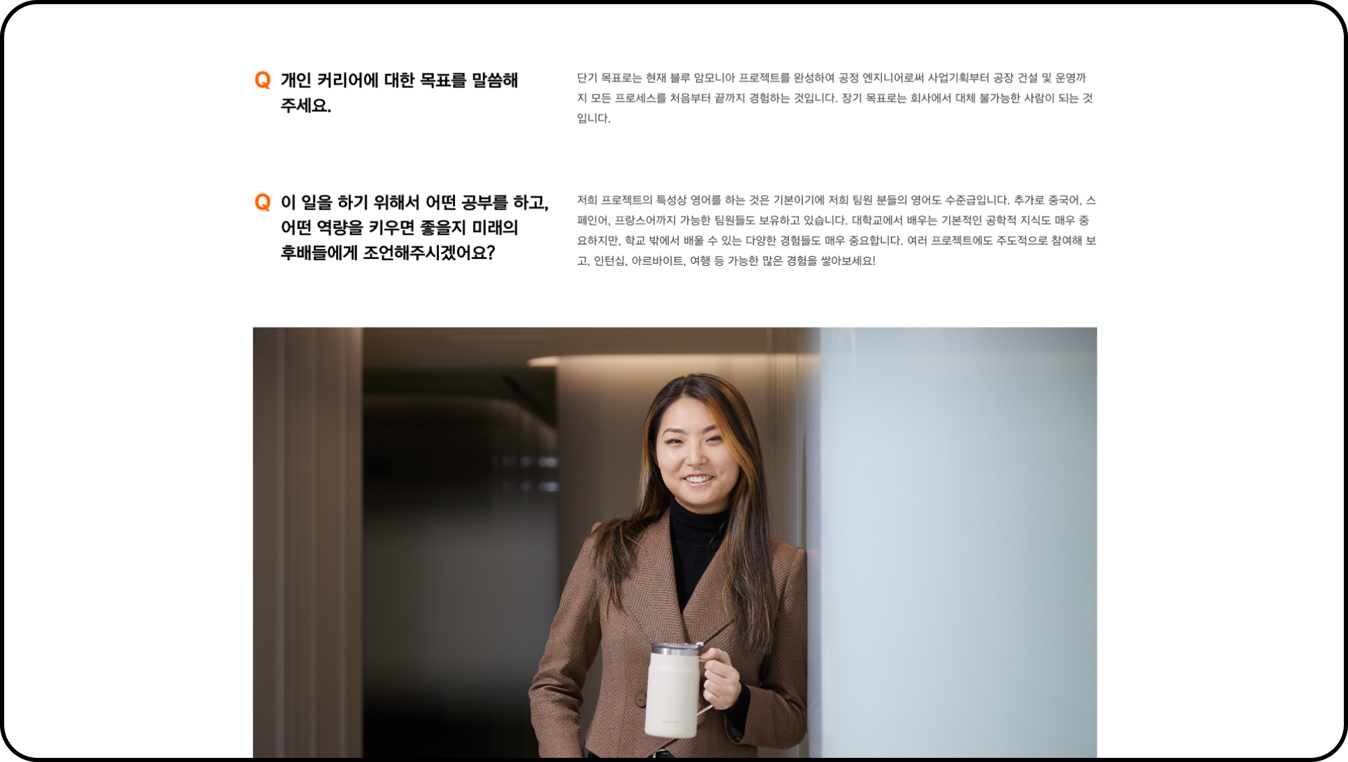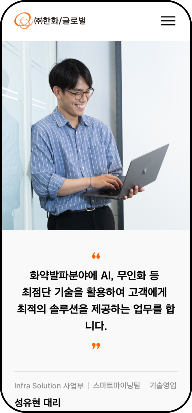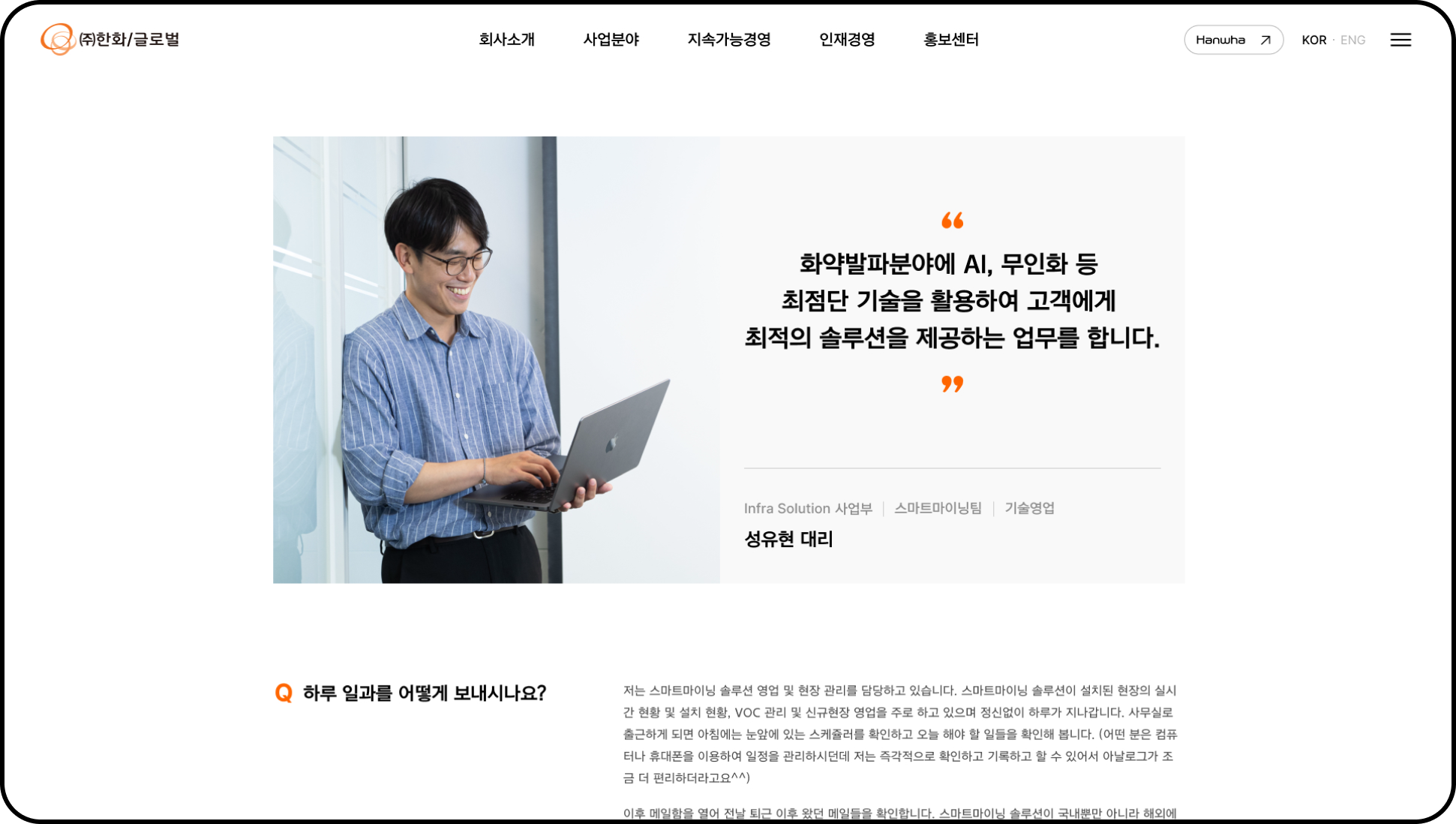 주요 페이지 상단은 인트로 형식의 비주얼로 디자인하여 콘텐츠에 무게감을 더하고, 충분한 여백을 활용해 정보 간 간섭을 최소화함으로써 전달력을 높였습니다. 특히 직무 소개 파트는 임직원의 실제 경험을 바탕으로 한 진솔한 이야기를 담아, 입사 희망자들에게 기업과 직무에 대한 깊이 있는 정보를 제공합니다. 또한 별도의 촬영을 통해 임직원의 생생한 모습을 담아냄으로써, 한화글로벌이 추구하는 인재상과 그 방향성을 진정성 있게 전할 수 있도록 구성했습니다.