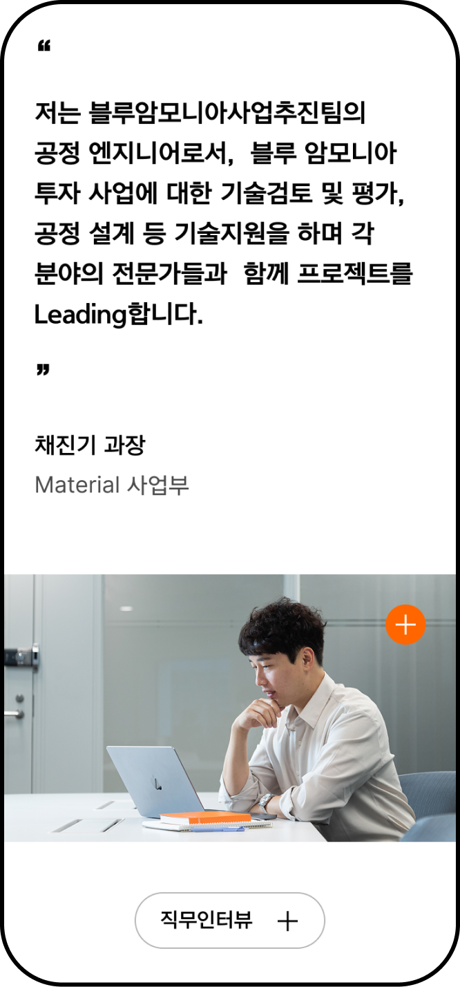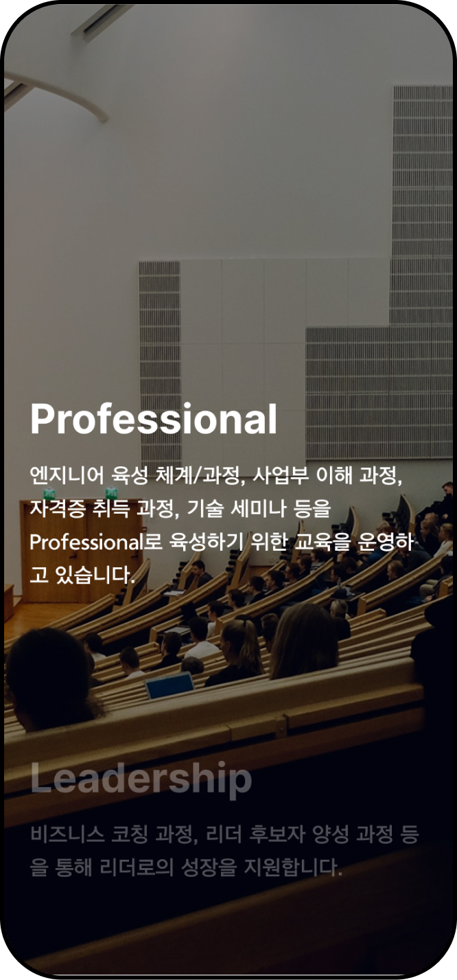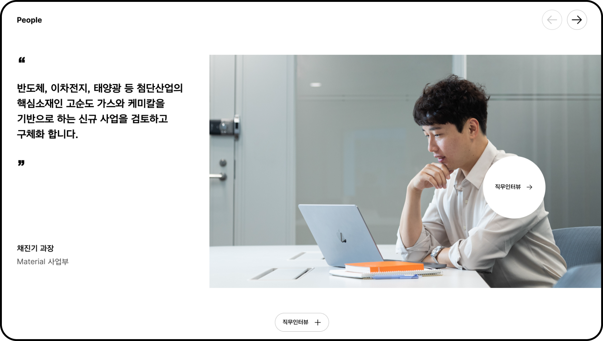 주요 페이지 상단은 인트로 형식의 비주얼로 디자인하여 콘텐츠에 무게감을 더하고, 충분한 여백을 활용해 정보 간 간섭을 최소화함으로써 전달력을 높였습니다. 특히 직무 소개 파트는 임직원의 실제 경험을 바탕으로 한 진솔한 이야기를 담아, 입사 희망자들에게 기업과 직무에 대한 깊이 있는 정보를 제공합니다. 또한 별도의 촬영을 통해 임직원의 생생한 모습을 담아냄으로써, 한화글로벌이 추구하는 인재상과 그 방향성을 진정성 있게 전할 수 있도록 구성했습니다.
