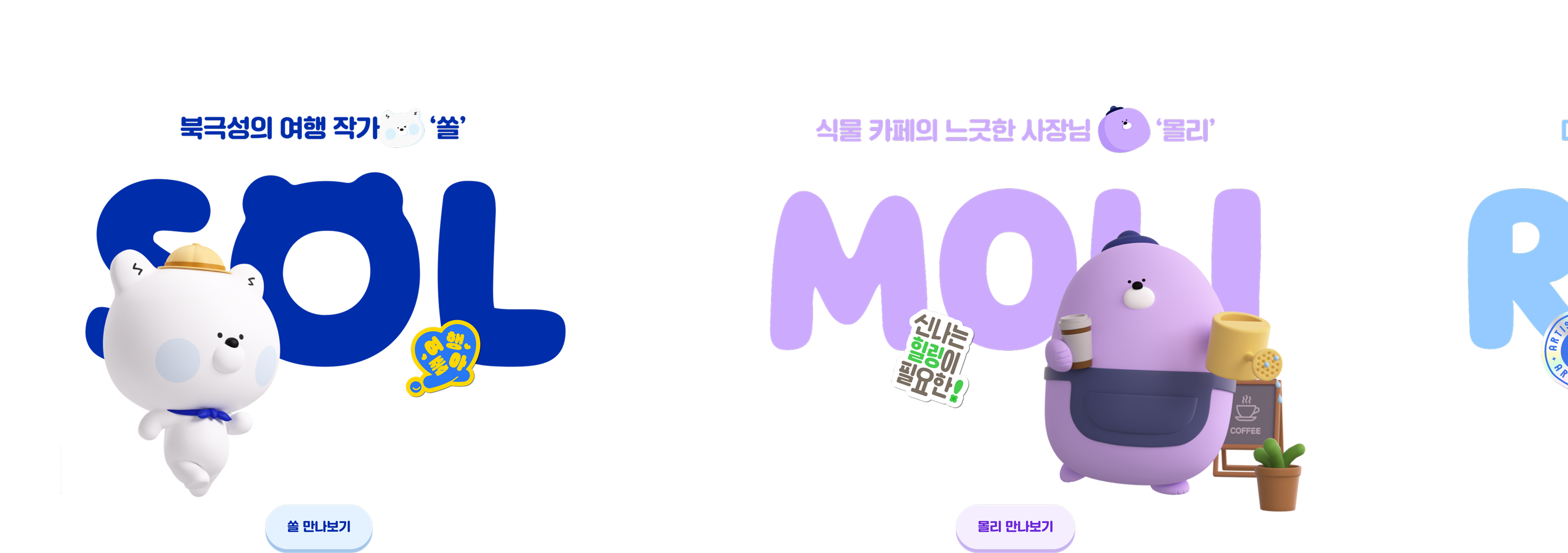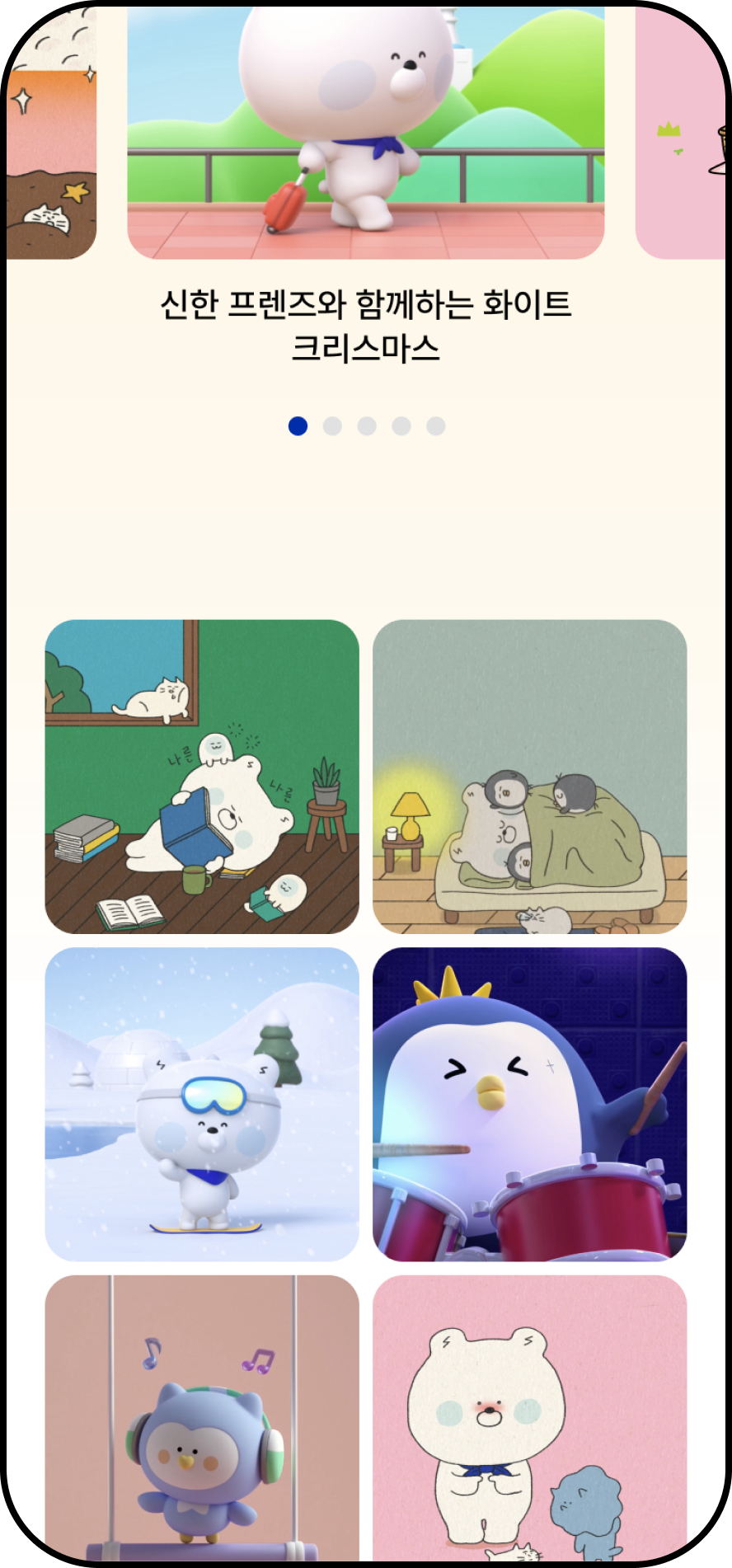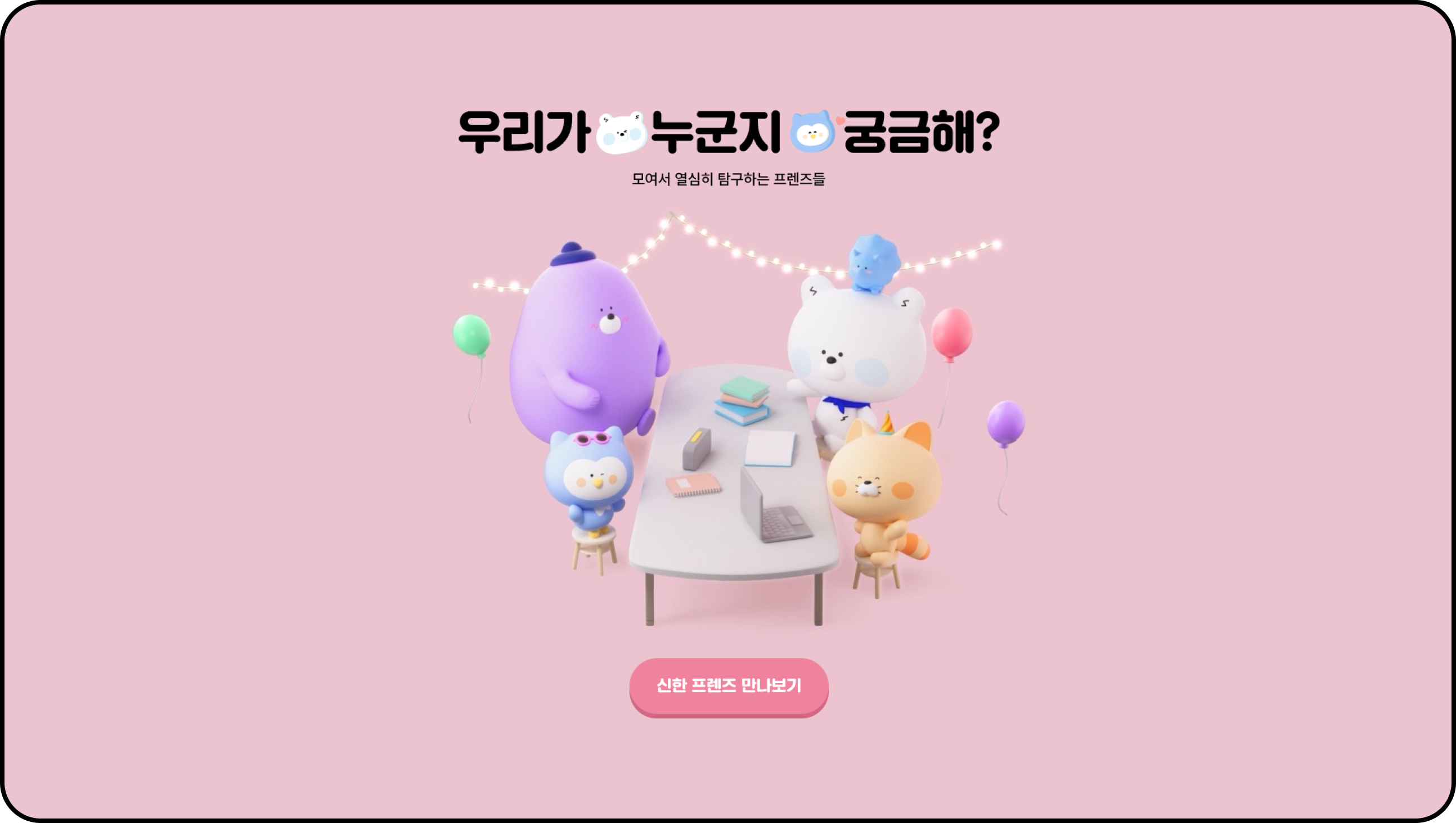 신한프렌즈는 각 캐릭터마다 개성 넘치고 흥미로운 스토리를 지니고 있으며, 이들이 모여 하나로 어우러질 때 또 다른 새로운 이야기로 확장됩니다. 이렇게 다채롭고 독창적인 캐릭터의 매력을 더욱 생생하게 전달하기 위해 3D 애니메이션을 적극 활용했으며, 각 캐릭터의 특징을 직관적으로 보여줄 수 있는 키워드와 아이콘 등을 함께 구성해 입체적이고 풍성한 소개가 이루어지도록 했습니다.