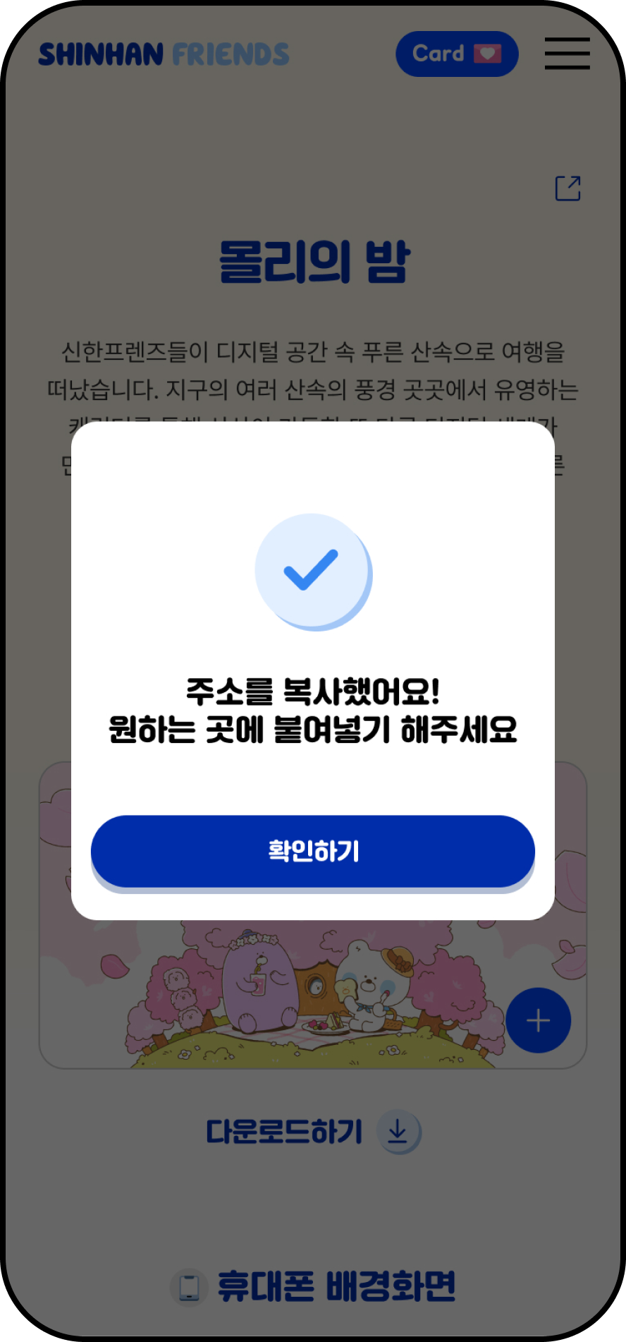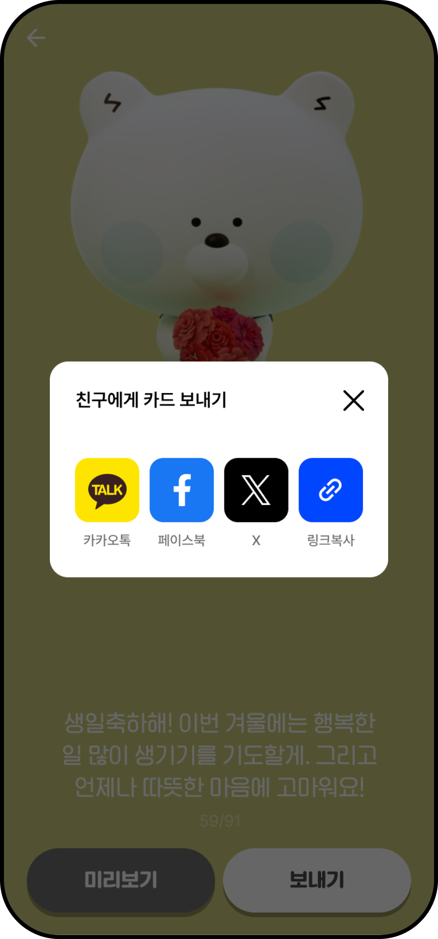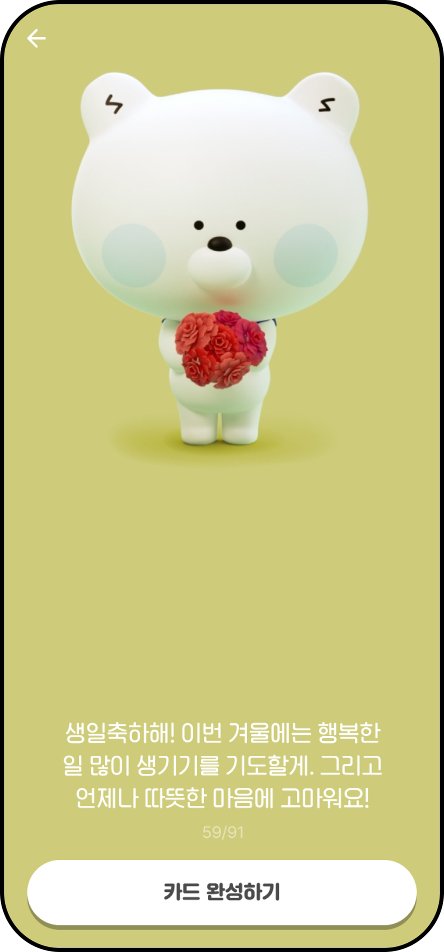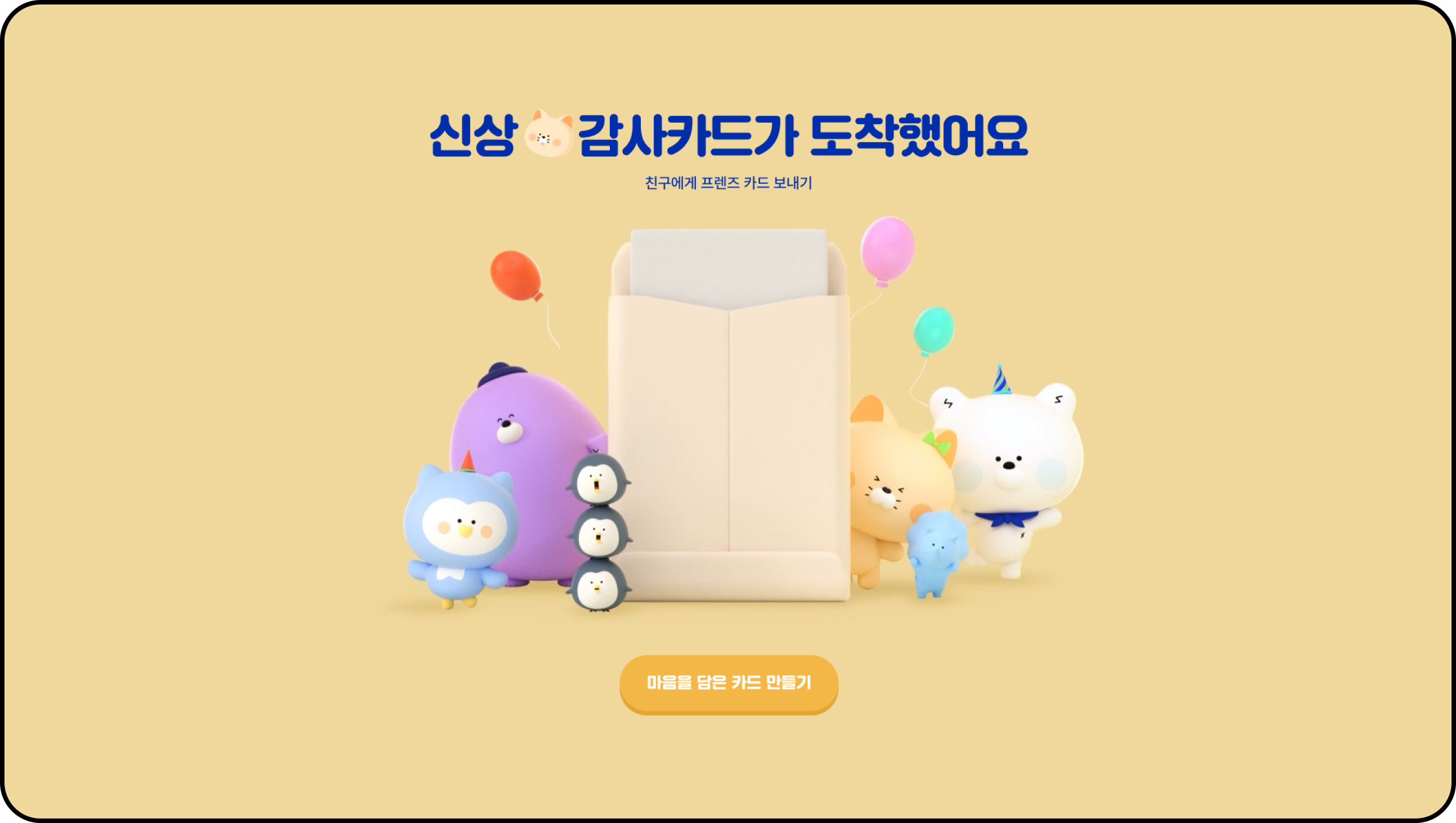 주요 콘텐츠로는 ‘감사카드 보내기’ 기능이 있으며, 사용자는 원하는 카드를 선택해 직접 메시지를 작성하고 지인에게 손쉽게 공유할 수 있습니다. 감사카드에는 모든 캐릭터가 균형 있게 활용되었으며, 각 카드의 주제는 위트 있고 흥미로운 방식으로 해석되어 짧은 영상으로 연출되었습니다. 이를 통해 사용자는 캐릭터의