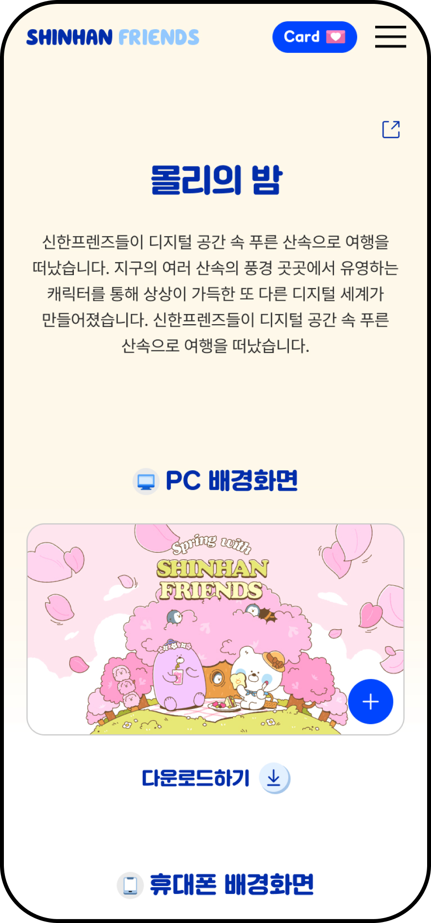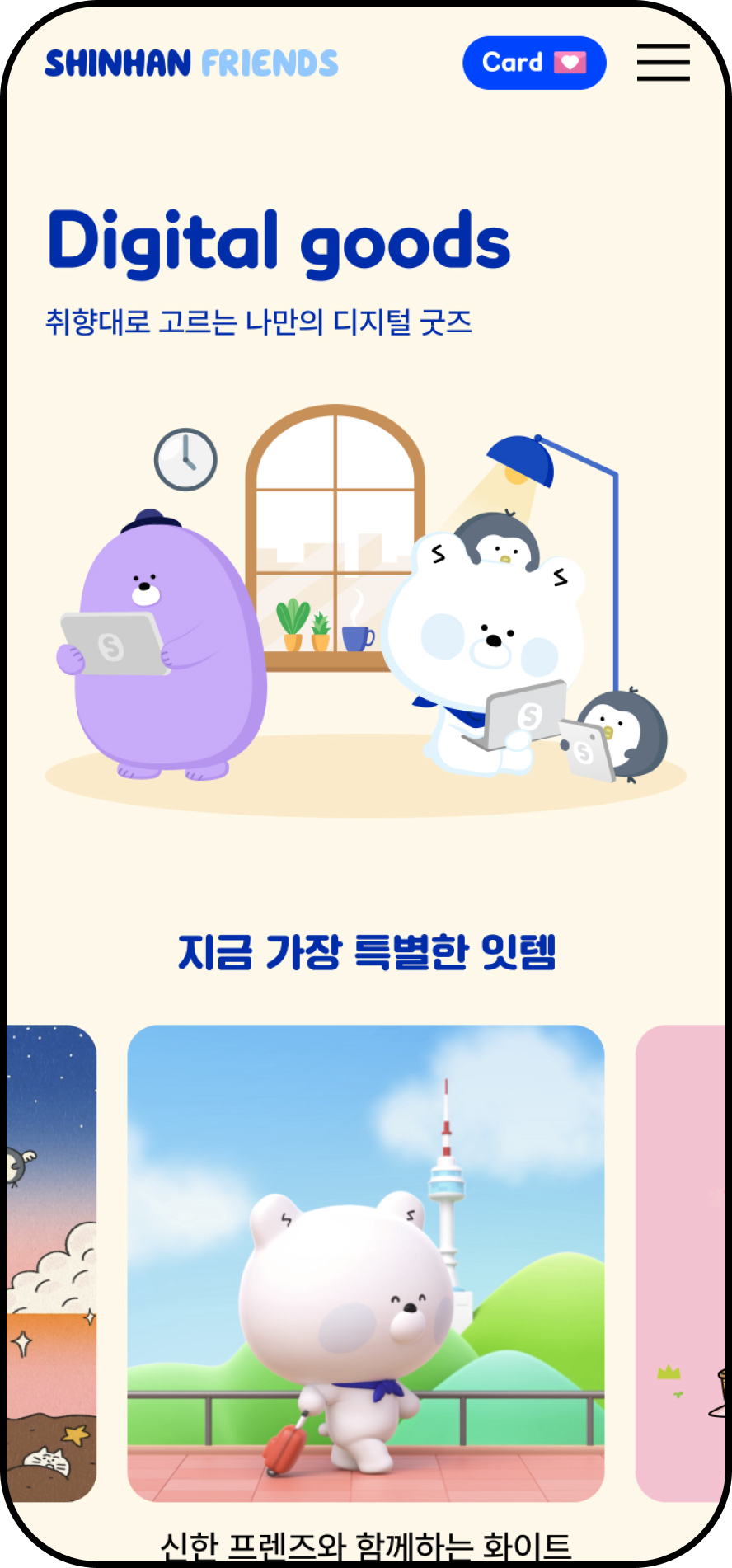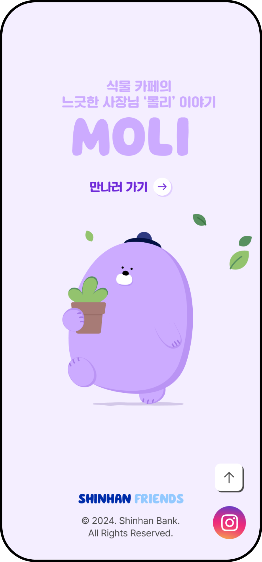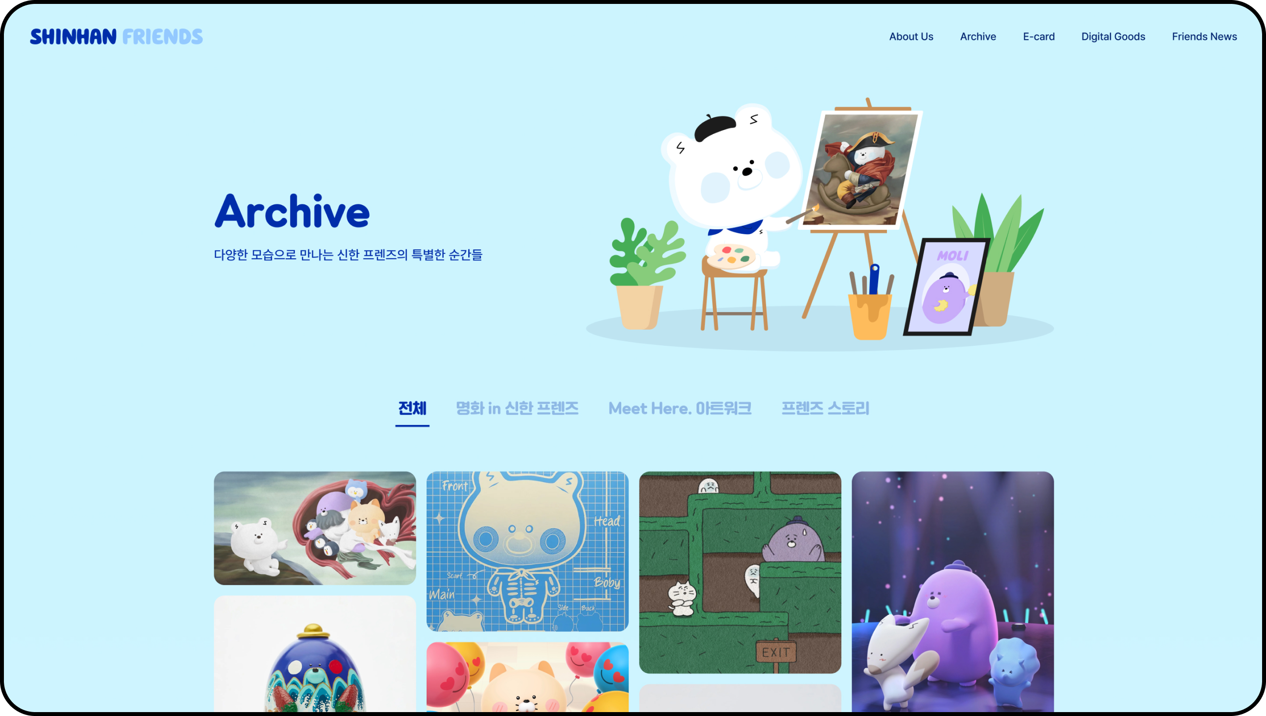 신한은행의 캐릭터를 체계적으로 소개하고, 다양한 관련 자료를 한곳에서 열람할 수 있도록 마련된 아카이브 플랫폼입니다. 그동안 완성도 높은 캐릭터들이 여러 매체를 통해 활발히 활용되어 왔지만, 일반 사용자들이 보다 쉽게 접하고 이해할 수 있는 전용 채널의 필요성이 꾸준히 제기되었습니다. 이에 우리는 각 캐릭터의 배경 이야기와 고유한 특징을 풍부하게 담아 소개하고, 다양한 결과물을 직관적으로 한눈에 확인할 수 있는 구조로 플랫폼을 설계했습니다. 또한 3D 애니메이션을 적극적으로 도입해 캐릭터의 매력을 더욱 생동감 있게 표현함으로써, 사용자가 단순히 정보를 얻는 데 그치지 않고 역동적이고 몰입적인 경험을 즐길 수 있도록 구현했습니다.